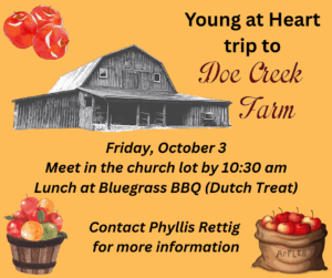 Young at Heart will travel to Doe Creek Apple Orchard on Wednesday, October 1. Meet at Church on Main by 10:30 AM. Arrive at Doe Creek at 11:15 AM. Lunch (Dutch treat) will be at Bluegrass BBQ in Pearisburg. For more details, reach out to Phyllis Rettig.